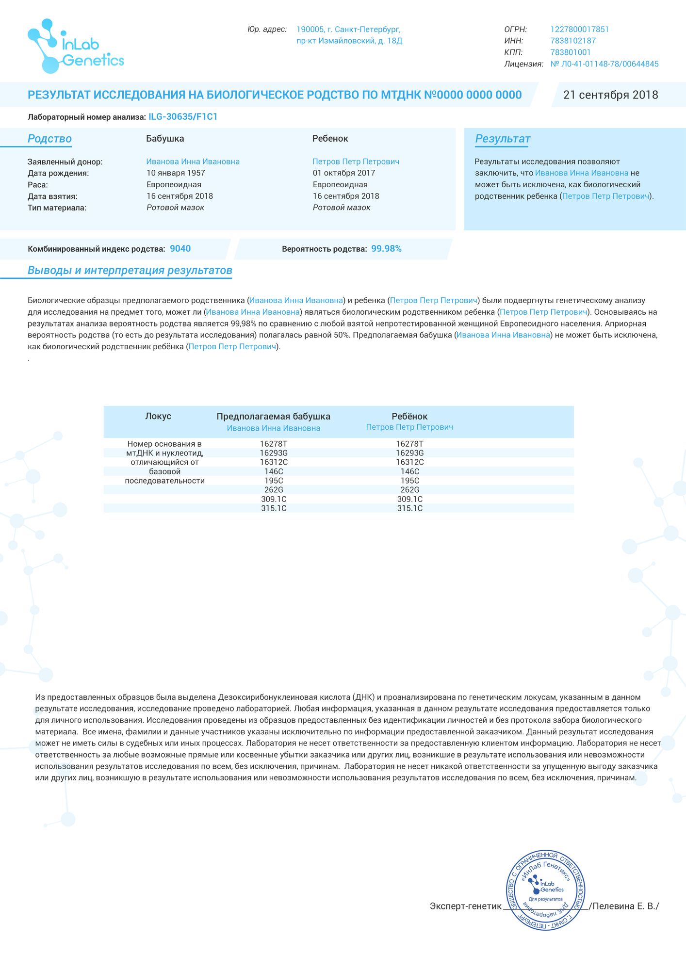Точность метода достигает 99,999999% на подтверждение родства. Лаборатория проводит параллельно два теста разными группами специалистов. Затем результаты заверяются подписью заведующего лабораторией и печатью.